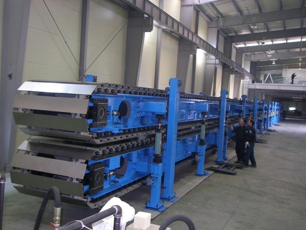 It can be divided into upper and lower mechanically and each part needed own driving system. Because of this, synchronization of both parts is a very important factor to get a high quality of sandwich panels. Also, surface flatness of slat is important, too.It is possible to adjust the height according to the producing the sandwich panel’s thickness and the side block system will be included to contrast the thrust of polyurethane foam.