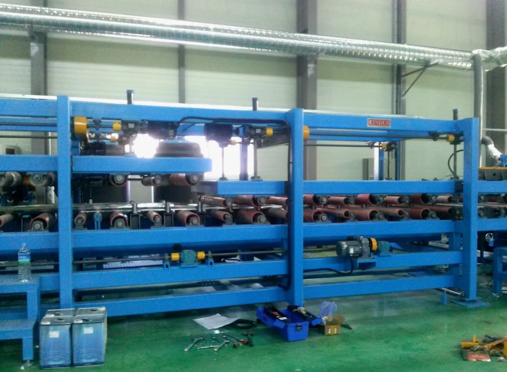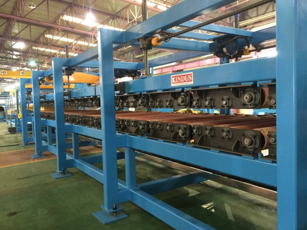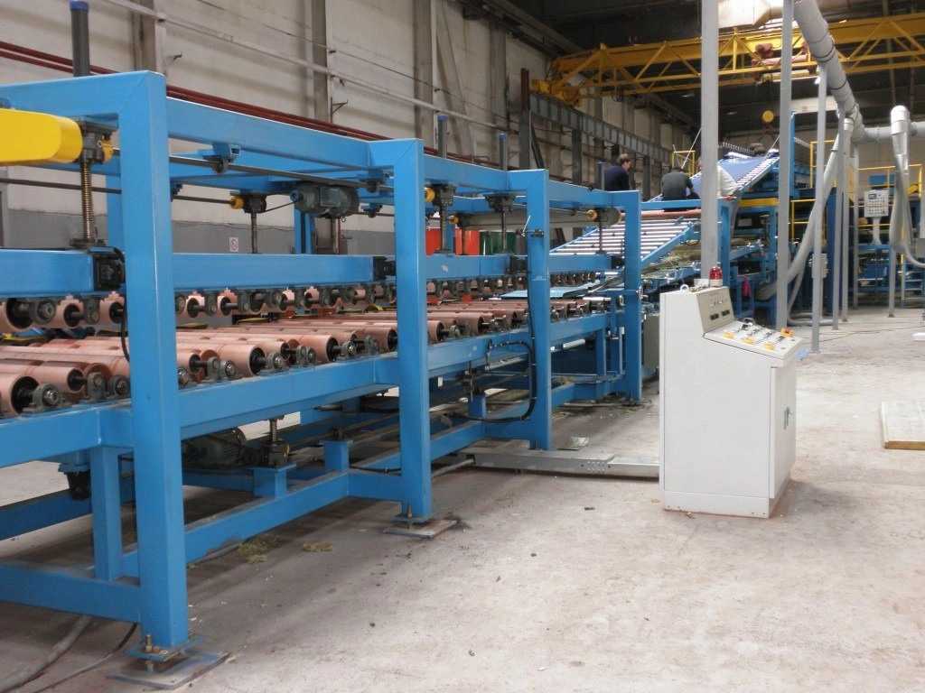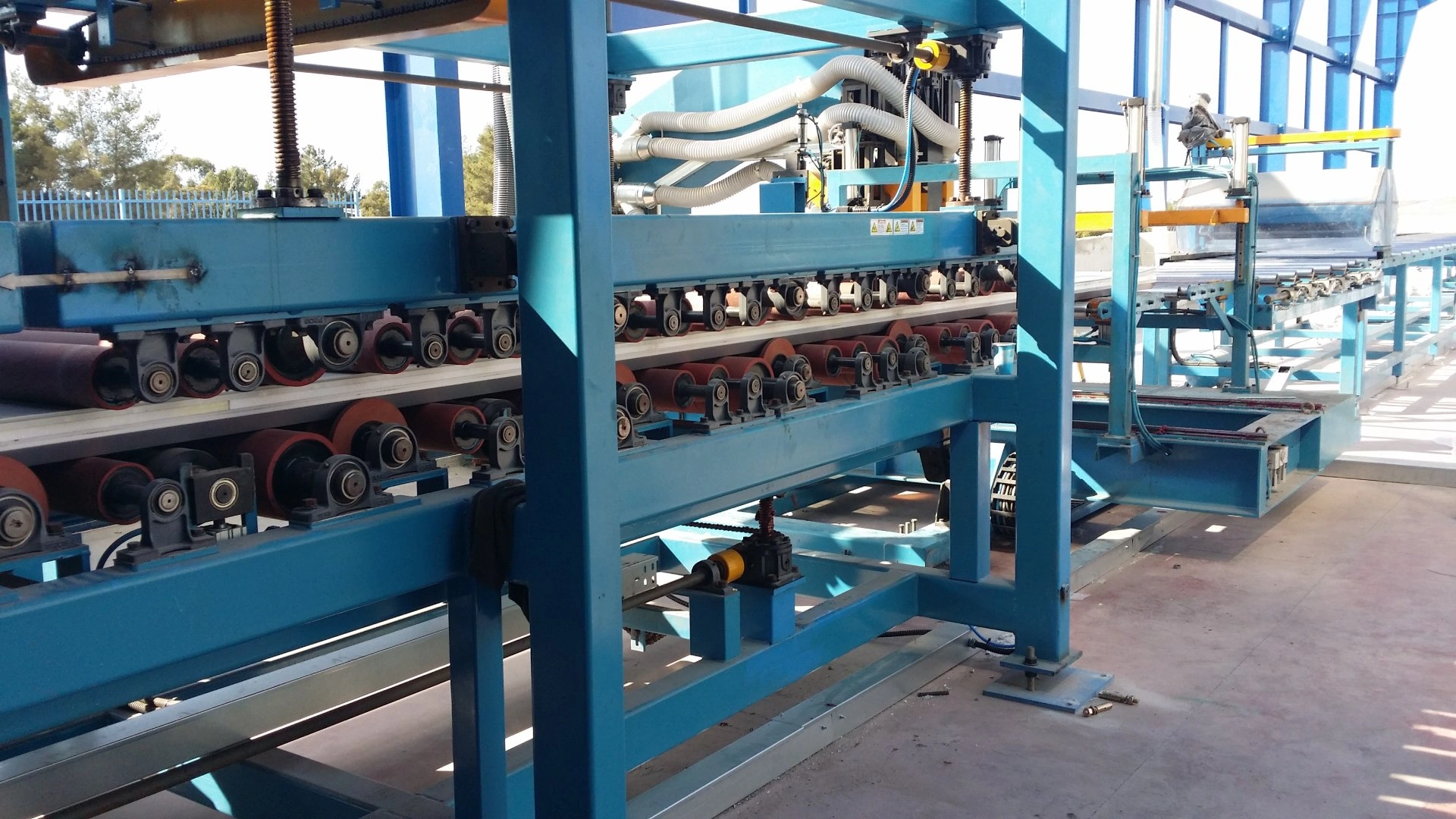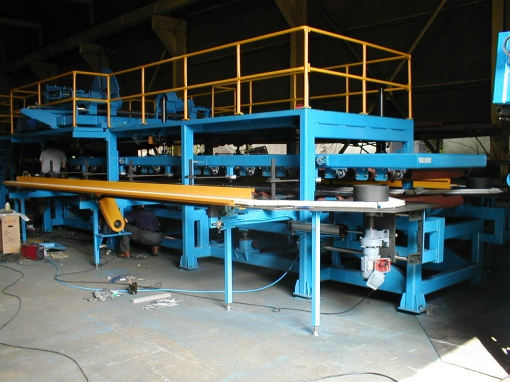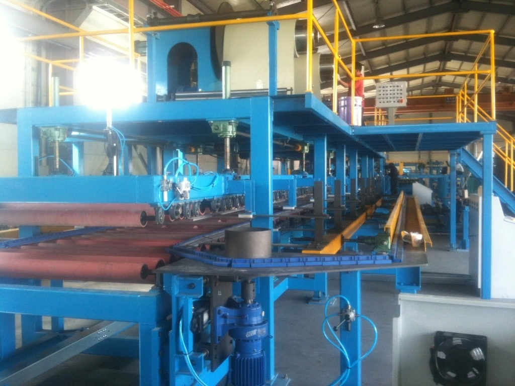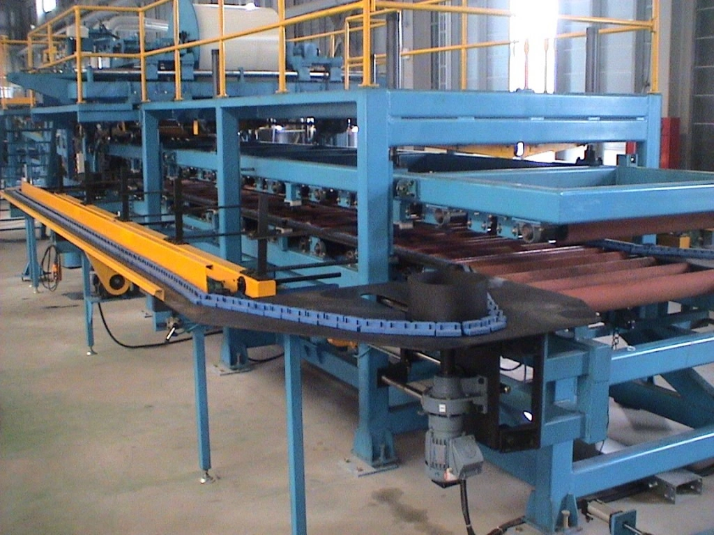 Laminating system is to bond the EPS board or mineral-wool lamellas to the glue applied color steel sheet. The reaction pressure of the polyurethane foam, which used for adhesive, is bearable level with rubber coated rollers at regular intervals. So, it can be used instead of double belt slat conveyor to save the investment cost.